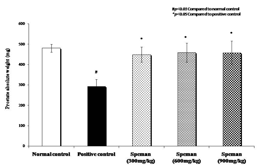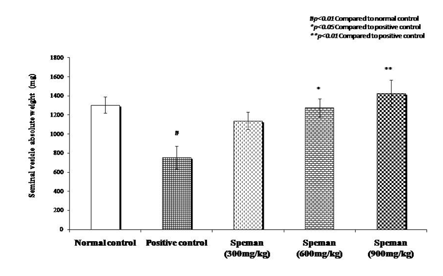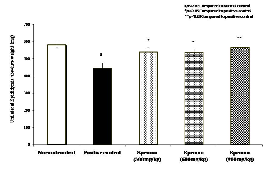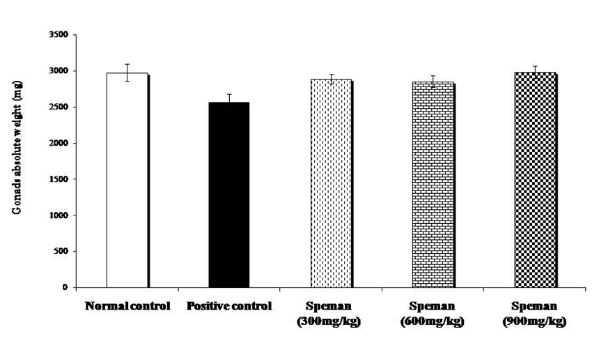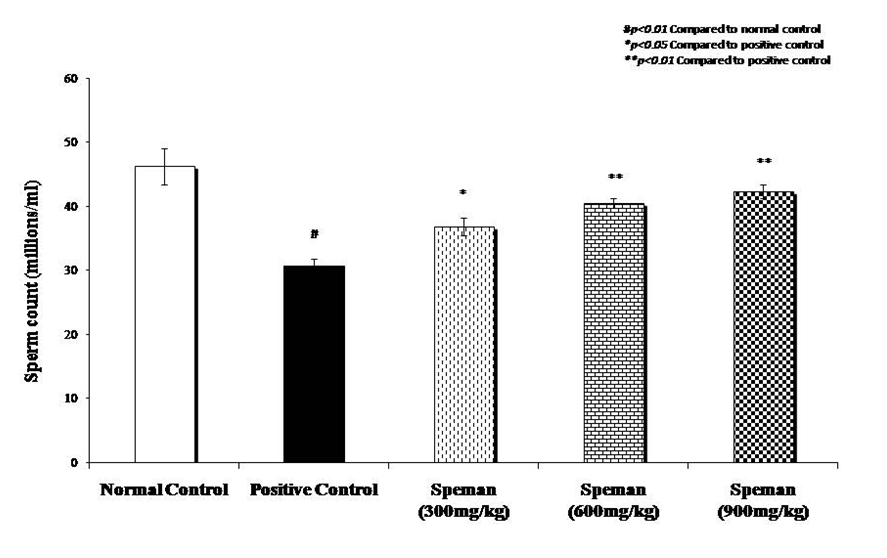 Results: Changes that occurred due to the administration of CP at a dose of 100 mg/kg body weight were dose dependently reversed with Speman® at a dose of 300, 600, and 900 mg/kg body weight. There was a statistically significant increase in sperm count and the weight of the seminal vesicle, epididymis, and prostate.
