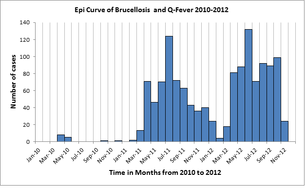 Methods and Materials: An outbreak of 1,317 cases of brucellosis and Q fever was investigated from May 2011 to the end of 2012 in Bamyan province of Afghanistan.A total of 100 cases were selected by random sampling with equal number of neighbor controls. Data were collected through structured questionnaire.